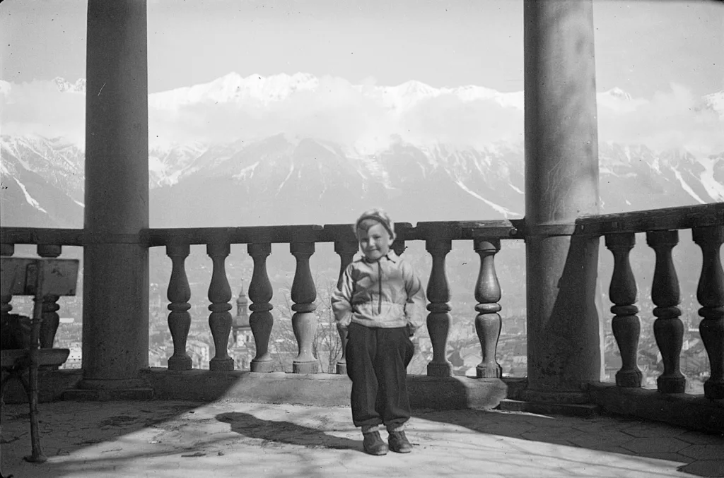 Bei der nächsten Abbildung handelt es sich um eine schwarz-weiß Fotografie aus der Sammlung Walter Kreutz, das von Emil Schneider um das Jahr 1930 herum aufgenommen wurde. Darauf zu sehen ist ein kleiner Bub, der im Pavillon am Bergisel lächelnd, mit den Händen in den Hosentaschen, für den Fotografen posiert.
