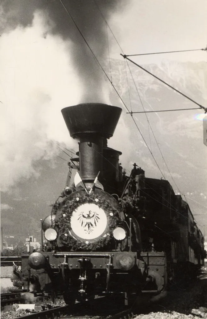 Zum Auftakt unserer kleinen Reise habe ich ergänzend zum Album eine etwas jüngere Aufnahme ausgewählt. Sie zeigt eine festlich geschmückte Lokomotive anlässlich des 100-Jahr-Jubiläums der Brennerbahn im Jahr 1967 in Innsbruck. Um welchen Lokomotivtyp es sich dabei genau handelt und ob diese Maschine tatsächlich früher auf der Brennerstrecke im Einsatz war, ist mir leider nicht bekannt. Vielleicht können uns hier unsere fachkundigen Leserinnen und Leser weiterhelfen?