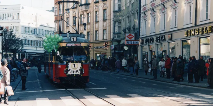 Auf unserer Aufnahme sind die beiden neuen Panoramawagen (Untergestell von Waagner-Biro, Aufbau von Gräft & Stift) bereits auf die Trasse gesetzt worden. Sie stehen aber beide noch herunten auf der Innbrücke. Das wird sich schon bald ändern, denn bereits am 23. Juli 1958 ging die Hungerburgbahn wieder in Betrieb.
