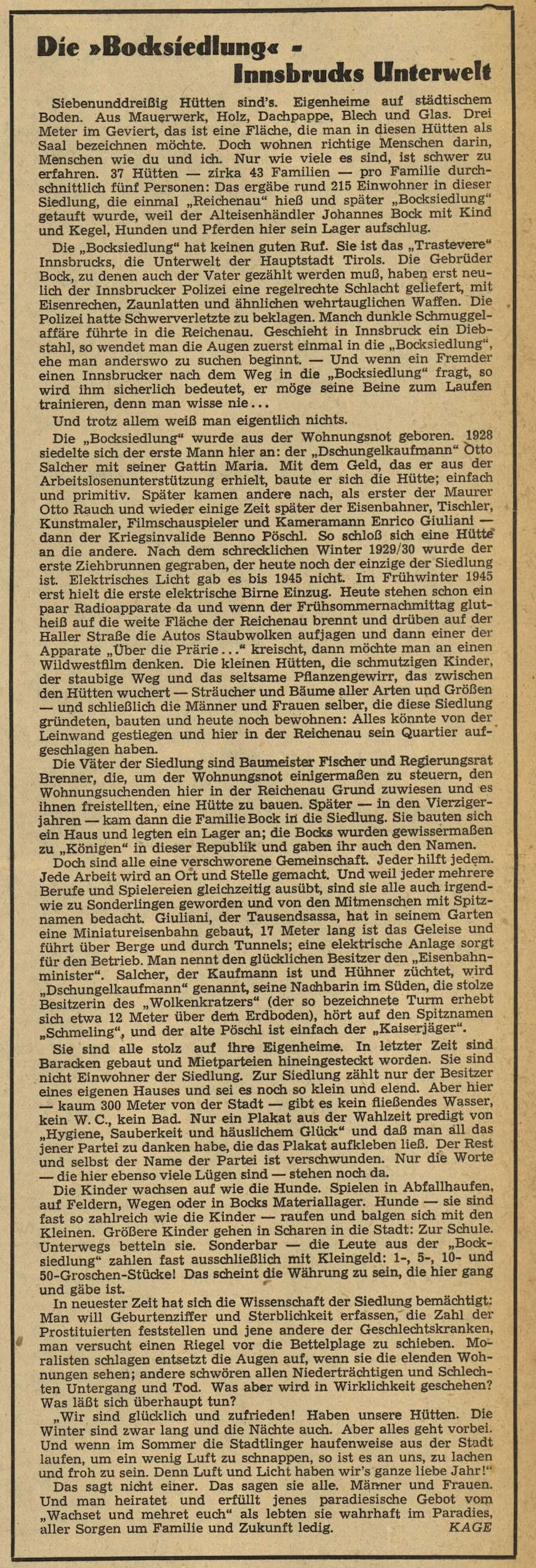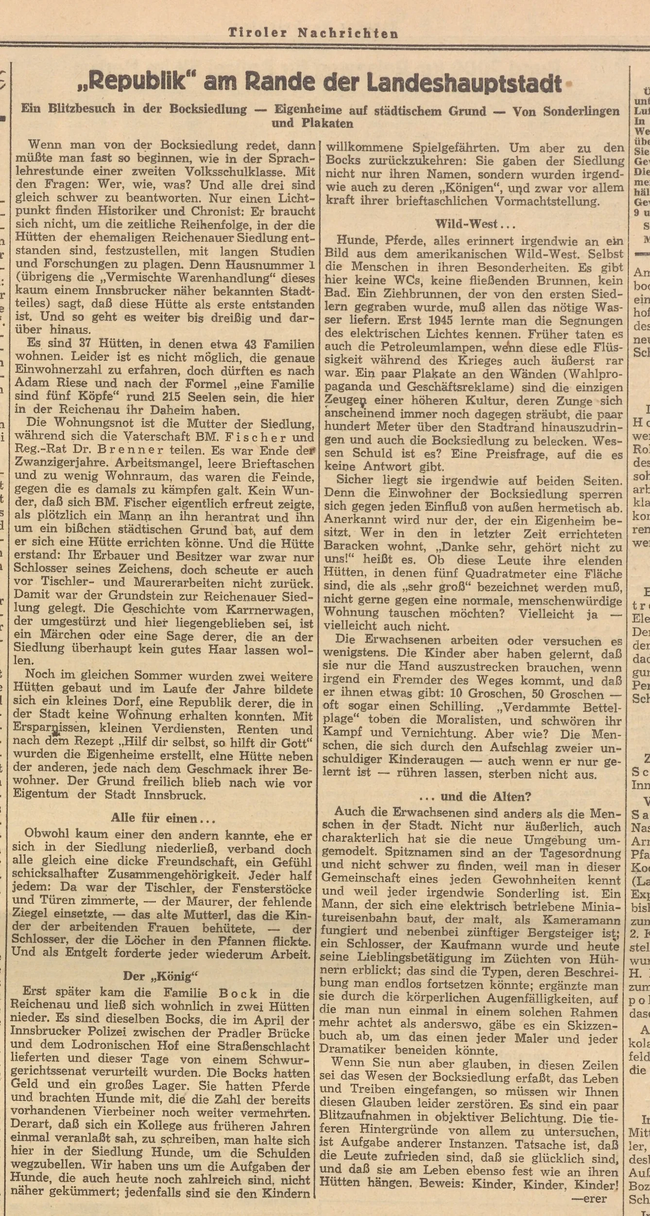 Der erst später bekannt gewordene Südtiroler Autor Claus Gatterer schrieb als 26 Jahre junger Journalist der Tiroler Nachrichten einen Artikel für die Salzburger Nachrichten, der als gut beobachtende Sozialreportage angelegt ist aber auch beißenden Spott über die Innsbrucker Bourgeoisie enthält. In dieser Form konnte der Artikel wohl nur außerhalb Tirols erscheinen. Einige Monate später verfasste er einen inhaltlich ähnlichen Bericht über die Bocksiedlung für die Tiroler Nachrichten, der nicht annähernd so pointiert gehalten war. Das mit den redaktionsinternen Kürzeln ist so eine Sache. Man unterschriebt einerseits und dann auch wieder nicht so richtig, wenn keiner weiß wer dahinter steckt. Bei RAU im Standard ist es ja leicht zu erraten, dass Hans Rauscher gemeint ist. Bei diesen Dechiffrierungen der Gatterer Kürzel war ich auf die Hilfe von zwei Studenten angewiesen, die seiner Spur mit Akribie gefolgt sind.