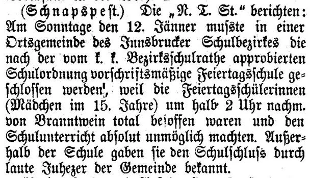 Über die Übel des Alkohols und den Kampf gegen ihn wurde hier bereits geschrieben. Aber auch im Blick der Verfechter der Abstinenz war nicht jeder Alkoholteufel gleich geschaffen. Die hochdestillierte Variation zog stets besonderen Zorn auf sich. Am 27. Januar 1896 berichteten die Innsbrucker Nachrichten auf der Titelseite über eine Sitzung des Tiroler Landtags zwei Tage zuvor, bei der „die Bekämpfung der Branntweinpest“ im Zentrum stand.