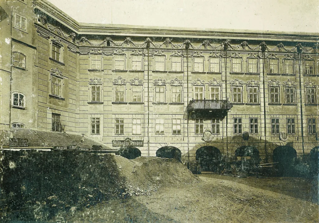 Wilhelm Trager betrieb auch eine Filiale in der Herzog-Friedrich-Straße 3. Auf dem folgenden Foto, das während der großen Kanalbauarbeiten in der Altstadt, im Jahr 1903 entstanden ist, kann man das Firmenschild erkennen und hinter großen Schuttbergen die Schaufenster des Geschäfts erahnen.