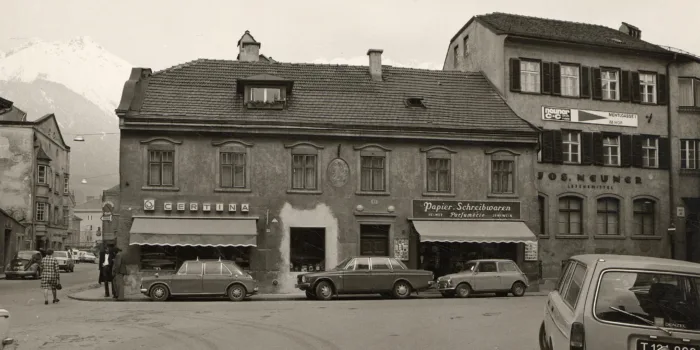 Der Branntweinbrenner Karl Weis erscheint erstmals 1953 im Innsbrucker Adressbuch mit der Adresse Höttinger Au 85, die Baracke davor dürfte wie viele dieser Behelfsbehausungen bis Mitte der 1960er an dieser Stelle gestanden sein. Für Profis erkennbar das Brettl über den Gießenbach zwischen den Blocks, im Hintergrund der Spätwinterszene die Oberleitungen der Mittenwaldbahn vor mit Naturschnee bedeckten Gipfeln der Rangger Köpfl-Gruppe.