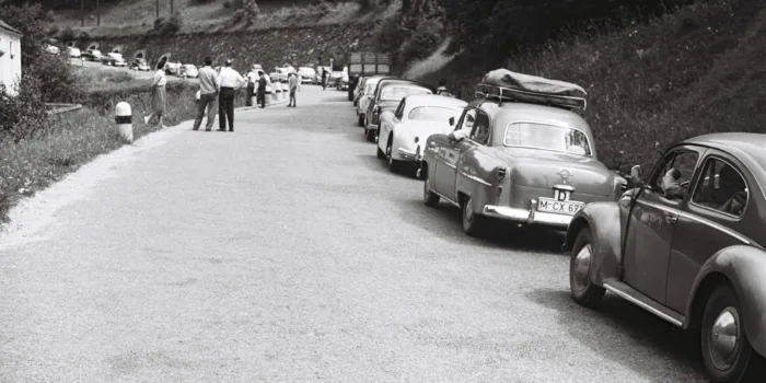 Doch schauen wir noch auf den Triebwagen. Im Führerstand ein Fahrer, der aber – sicher unrechtmäßig – nicht nach vorne schaut, sondern sich während der Fahrt zu den Passagieren umdreht. Im Wagen dürften sich einige Personen aus der Stadt befinden, was man an den ausladenden Hüten der Damen erkennen kann. Genau die richtige Adjustierung für eine Wanderung. Das Highlight ist aber sicherlich der besonders coole Mann auf der hinteren Plattform: Rauchend, mit einer Art Cowboy-Hut auf dem Kopf lehnt er sich gegen die Absperrkette und neigt sich so in der Kurve aus dem Wagen.