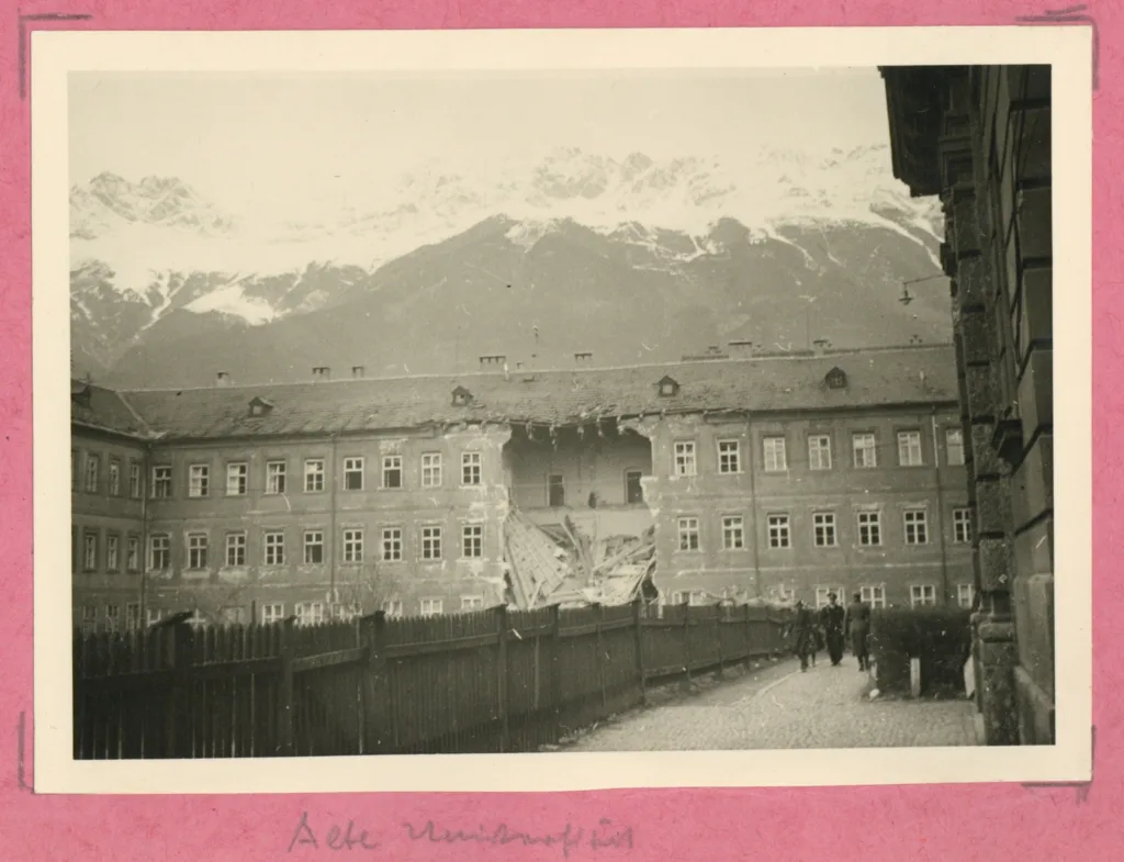 Weitere Bilder aus dem Album zeigen die Kirche vom Hof der Angerzellgasse aus… das sieht es nicht so wild aus aber man sieht wo die Bombe in die Kuppel eingeschlagen ist. Und eine weiteren schweren Treffer im Innenhof der Universität.