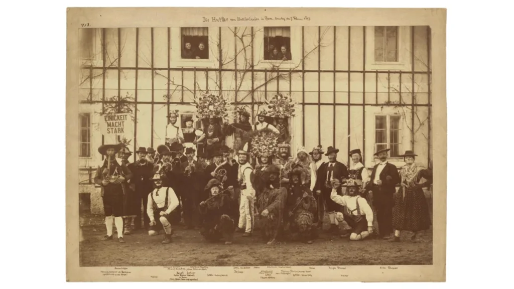 Auf dem ausgewählten Foto sind die Zottler gerade dabei den sogenannten Frosch auszuführen. Dabei springen sie zuvor in die Luft und landen dann mit angewinkelten Beinen auf dem Rücken. Anschließend kann ein Melcher oder Spiegeltuxer auf seinen Bauch steigen, womit der Sieg des Frühjahres über den Winter symbolisiert wird. Der heutige Fasnachts-Beitrag ist gleichzeitig auch ein kleines Rätsel. Die Vermutung liegt nahe, dass es sich auf dem Foto um Zottler der Mühlauer Muller handelt. Bei meiner Recherche erhielt ich nämlich den Hinweis, dass die Mühlauer Muller eine Zeitlang Handschuhe bei ihren Auftritten trugen, wie sie auch hier auf dem Bild klar zu erkennen sind. Aber vielleicht können Sie, liebe Leserinnen und Leser, die Vermutung endgültig bestätigen? Waren Sie an dem Tag des Umzugs vor Ort und können sich noch daran erinnern? Lassen Sie es mich in den Kommentaren wissen!
