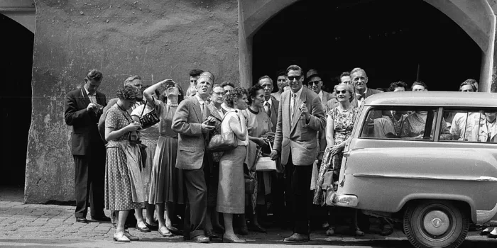 Markttag an einem Spätwintersamstag. Die Innsbrucker*innen gehen zum Innrain, um sich mit Lebensmitteln und Bedarfsartikeln zu versorgen. Ein Schild bittet die Käufer*innen, Hunde an der Leine zu halten, was wie üblich etwa einen Meter daneben schon nicht mehr so genau genommen zu werden scheint. Die Sonne steht tief im Süden, aber es dürfte nicht besonders kalt sein an diesem Spätvormittag. Trotzdem würde der Herr von Welt nicht ohne sein Loden-Cape, Stock und Hut und Meerschaumpfeife beim Männersammelplatz warten, bis die Gattin die Arbeit des Vormittags erledigt hat.