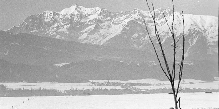 Heute blicken wir Kurt Reuter in der Höttinger Au über die Schulter. Dabei ist diesmal weniger der spezifische Ort das Bemerkenswerte, sondern das weitere, gesamte Ambiente. Die fast absolute Leere, der eher trostlose Gesamteindruck der Straße mit den schutz(weg)losen Passanten. Die Grautöne der Aufnahme unterstreichen diesen Eindruck noch weiter.
