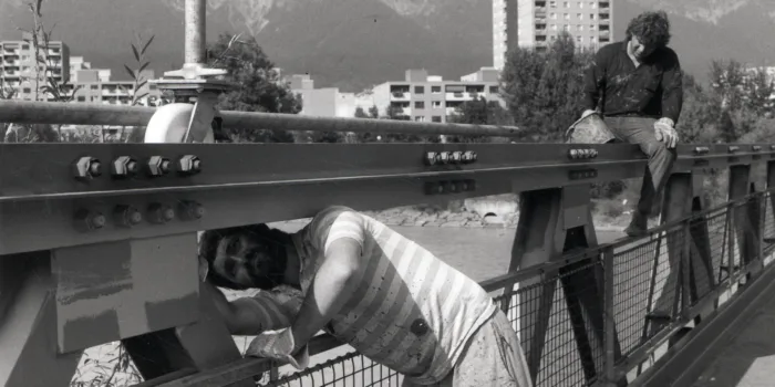 Selbstverständlich haben Sie den Ort des Geschehens bereits identifiziert. Hier wird gerade die Mühlauer Eisenbahnbrücke saniert. Leider ist die Aufnahme nicht datiert, aber vielleicht gelingt es Ihnen dieses Foto einem Jahr oder gar einem Monat zuzuordnen? Und wem das zu einfach ist (oder zu langweilig?), der kann sich ja einmal das untenstehende Foto genauer ansehen. Was hat es damit auf sich? Woher kommt das Wasser (draußen herrscht ja das schönste Wetter)? Fragen über Fragen …