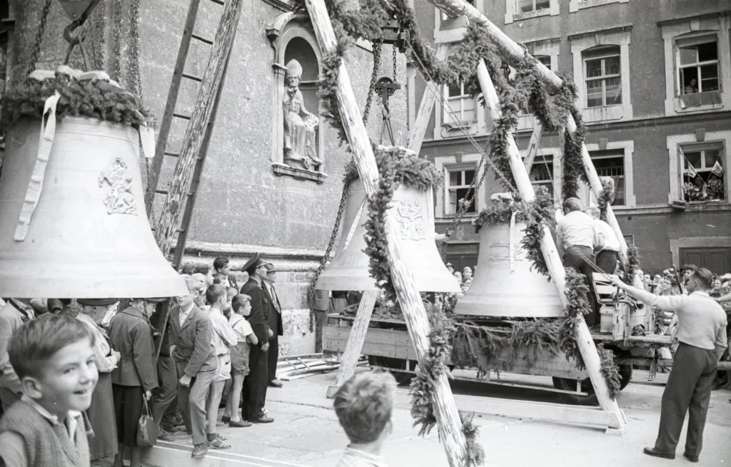 Jahrzehnte später, als am 19. September 2018 die neue Anna- und Petrus Canisius-Glocke eingeweiht wurde, weil die alte Glocke ersetzt werden musste, wurde „ein spezieller Autokran“ benötigt, um sie in den Südturm zu heben. Mich würde interessieren, wie man in den Sechziger Jahren mit dieser Herausforderung umgegangen ist. Die Glocken machen sich zwar sehr hübsch auf dem Foto, wo sie in dem Holzgestell hängen, allerdings müssen auch sie irgendwie in den Turm gekommen sein. Und ich vermute stark, dass die Pferdekutschen dazu nicht in der Lage waren. Doch davon hat uns Richard Frischauf leider keine Fotos hinterlassen.