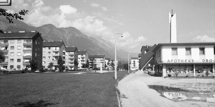Und schon wieder sind wir in Wilten unterwegs. Wir blicken von erhöhter Position auf eine Industrie- oder Lagerfläche. Auf dem Schild zu lesen ist der Name „Josef Köllensperger“. „Köllensperger“ ist natürlich kein unbekannter Name in Innsbruck Firmenwelt: Es gibt die „Köllensperger Eisen Industrie und Handels AG“ in der Kirschentalgasse 10, die Firma Köllensperger Anton in der Fischergasse 7. Die beiden gehörten (zumindest zeitweise) zusammen: im Adressbuch von 1924 wird unter „Eisen- und Metallwarenfabriken“ die Firmenadresse für Anton Köllensperger mit Kirschentalgasse 10 angegeben, das Lager befand sich in Fischergasse 7. Die Fa. Josef Köllensperger wird im Adressbuch als Tiefbaunternehmen geführt (die Zusammenhänge zwischen den Köllensperger’schen Firmen kann sicherlich jemand aus dem Leserkreis genauer erläutern). Als Adresse der Firma wird „Staatsbahnstraße 2“ angegeben, die 1930er Jahren zur „Egger-Lienz-Straße 2“ wird. Die heutige Egger-Lienz-Straße 2 entspricht aber sicherlich nicht dem hier abgebildeten Areal: entweder gab es noch eine Straßenumbenennung, oder hier war nur die Lager- und/oder Produktionsstätte untergebracht. Das Areal dürfte sich in etwa im Bereich der heutigen Adresse Anton-Melzer-Straße 11 befunden haben. Wenn Sie genau schauen, dann erkennen Sie auch, worauf sich der/die Fotograf/in hier positioniert hat.
