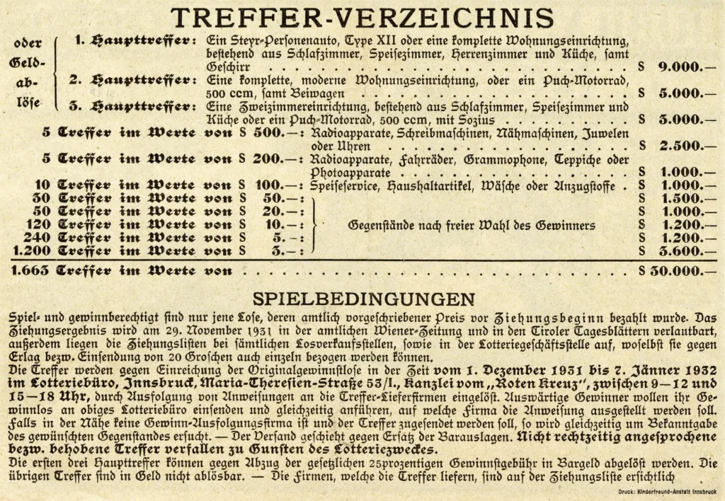 Der Hauptpreis war spektakulär: wahlweise ein Steyr Type XII, ein damals sehr prestigeträchtiges Auto, oder eine komplette Wohnungseinrichtung im Wert von 9.000 Schilling (heute rund 42.000 Euro). Auch die Plätze zwei und drei versprachen hohe Summen, die auf Wunsch sogar bar ausbezahlt werden konnten, allerdings mit einer Gewinngebühr von stolzen 25 %.
