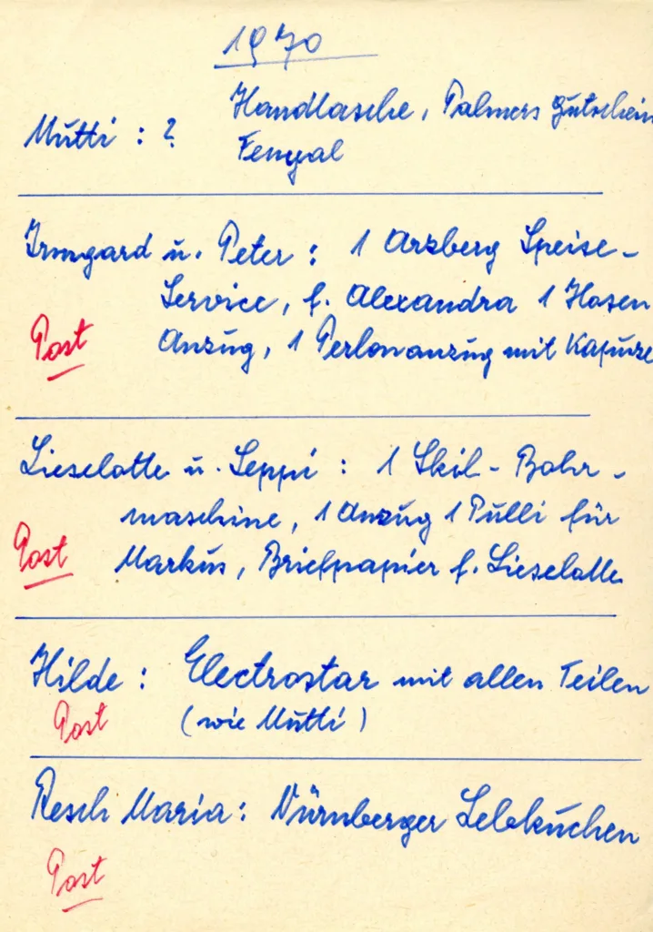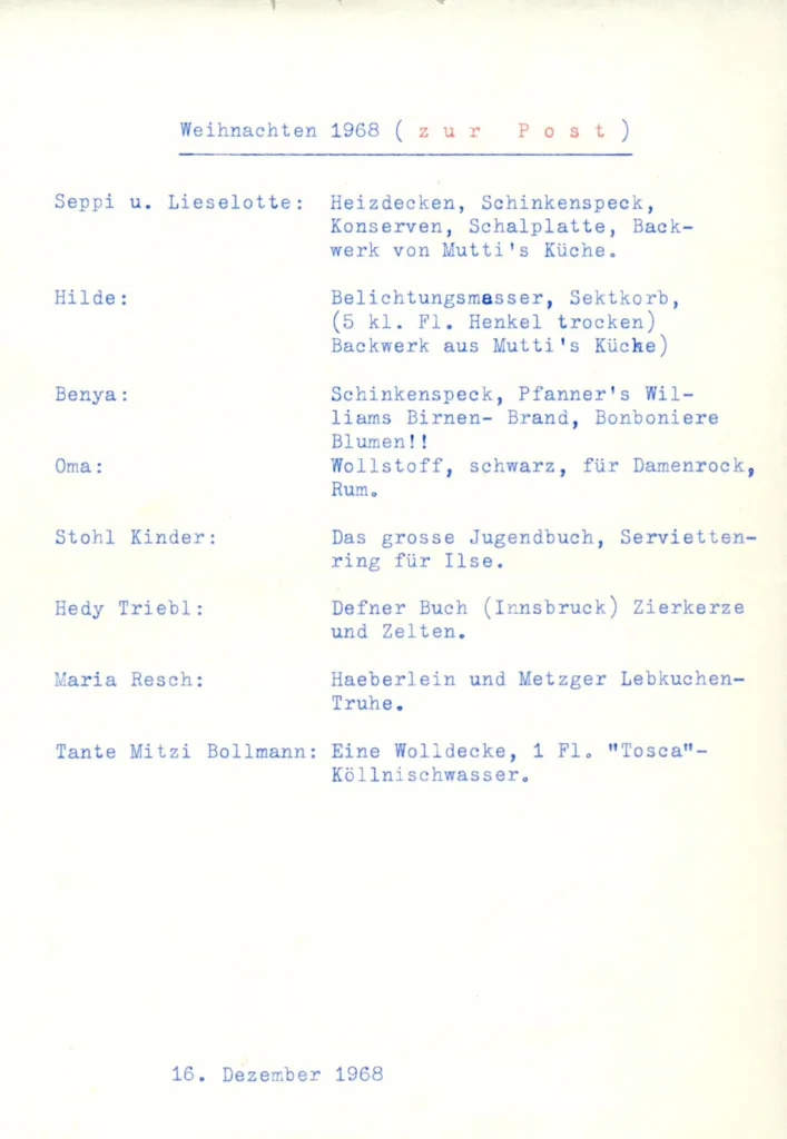Die Vorliebe von Sepp Douschan für Listen habe ich an dieser Stelle schon vorgestellt (hier, hier und hier). Es verwundert daher nicht, dass sich im Nachlass der Familie auch für Weihnachten entsprechende Listen finden. Dabei sind sowohl die mit Geschenken Bedachten als auch die entsprechenden Geschenke aufgelistet.