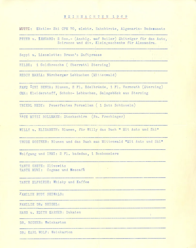 Im Jahr 1969 ist die Liste sehr umfangreich. Hier sind auch die engsten Familienmitglieder verzeichnet. Besonders freuen konnte sich damals die Gattin von Sepp Douschan, die ein neues Paar Ski erhielt – wobei der genannte Kästle CPM ein absoluter Top-Ski war. Auch über eine elektrische Zahnbürste konnte sie sich freuen. (Falls Sie das – wie mich – wundert: elektrische Zahnbürsten gibt es offenbar schon seit den 1930er Jahren….)