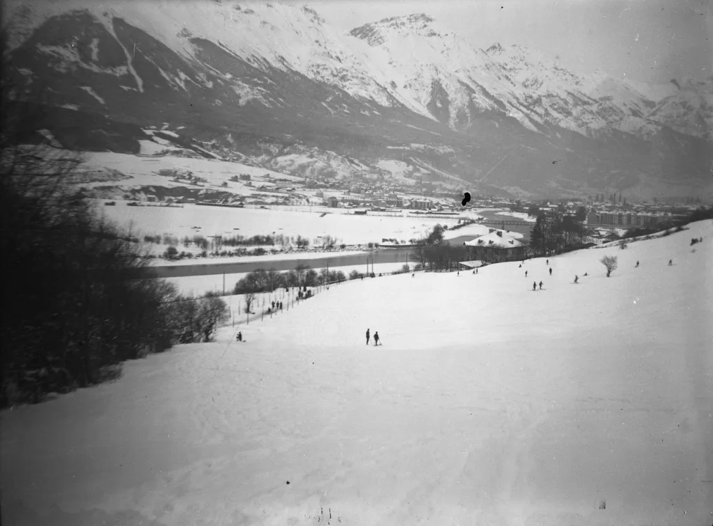 Die Gallwiese beim Schloss Mentlberg (hier im Bild) und die Ferrariwiese waren in der Frühzeit des Skisports (und auch darüber hinaus) beliebte Orte, um das Skifahren zu erlernen oder zu üben. Diesem Idyll an der Gallwiese drohte aber in der Zwischenkriegszeit ein jähes Ende, wie ein Zeitungsartikel aus dem Tiroler Anzeiger aus dem Jahr 1931 nahelegt.