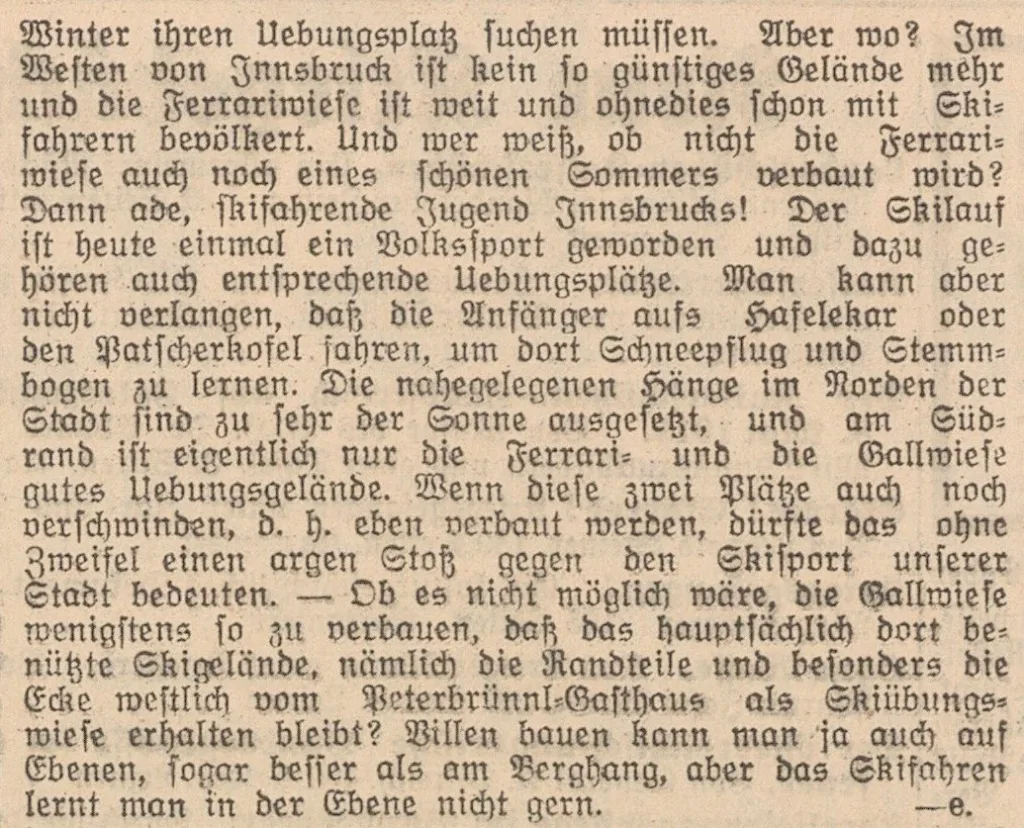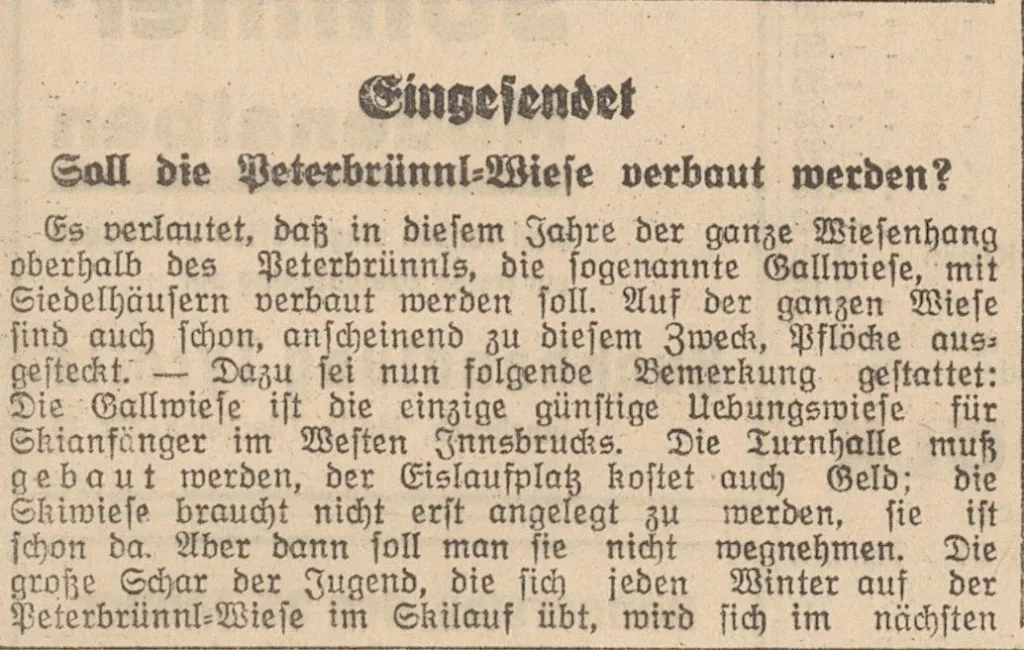 Damals wie heute war Wohnraum in Innsbruck knapp und damit ergaben sich eben auch Nutzungskonflikte. In diesem Fall blieb die Wiese indes noch für einige Jahre den Skifahrenden erhalten. Für die FIS-Wettkämpfe 1933 war in dieser Gegend eigens ein Slalomhang angelegt worden. Die Rennen wurden allerdings dann auf der Seegrube veranstaltet, da Tauwetter eine Austragung im Tal nicht zugelassen hatte. Erst Anfang der 1940er Jahre wurden schließlich die ersten Häuser oberhalb des Peterbründl errichtet – heute ist die ehemalige Skiwiese dicht mit Häuser bebaut.