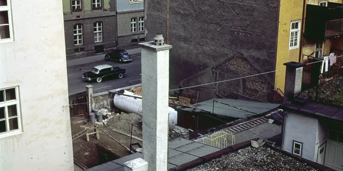 Zwischen Triumph-Pforte und Hochhaus der schöne Bismarck-Platz, davor Welser- und Fuggergasse die bald dem neuen Landhausplatz weichen werden müssen. Die heute mehrheitlich als Parkplatz bestehenden Grünanlagen des Servitenklosters sind gut zu erkennen wie auch die beiden Innenhöfe des Rathauses.