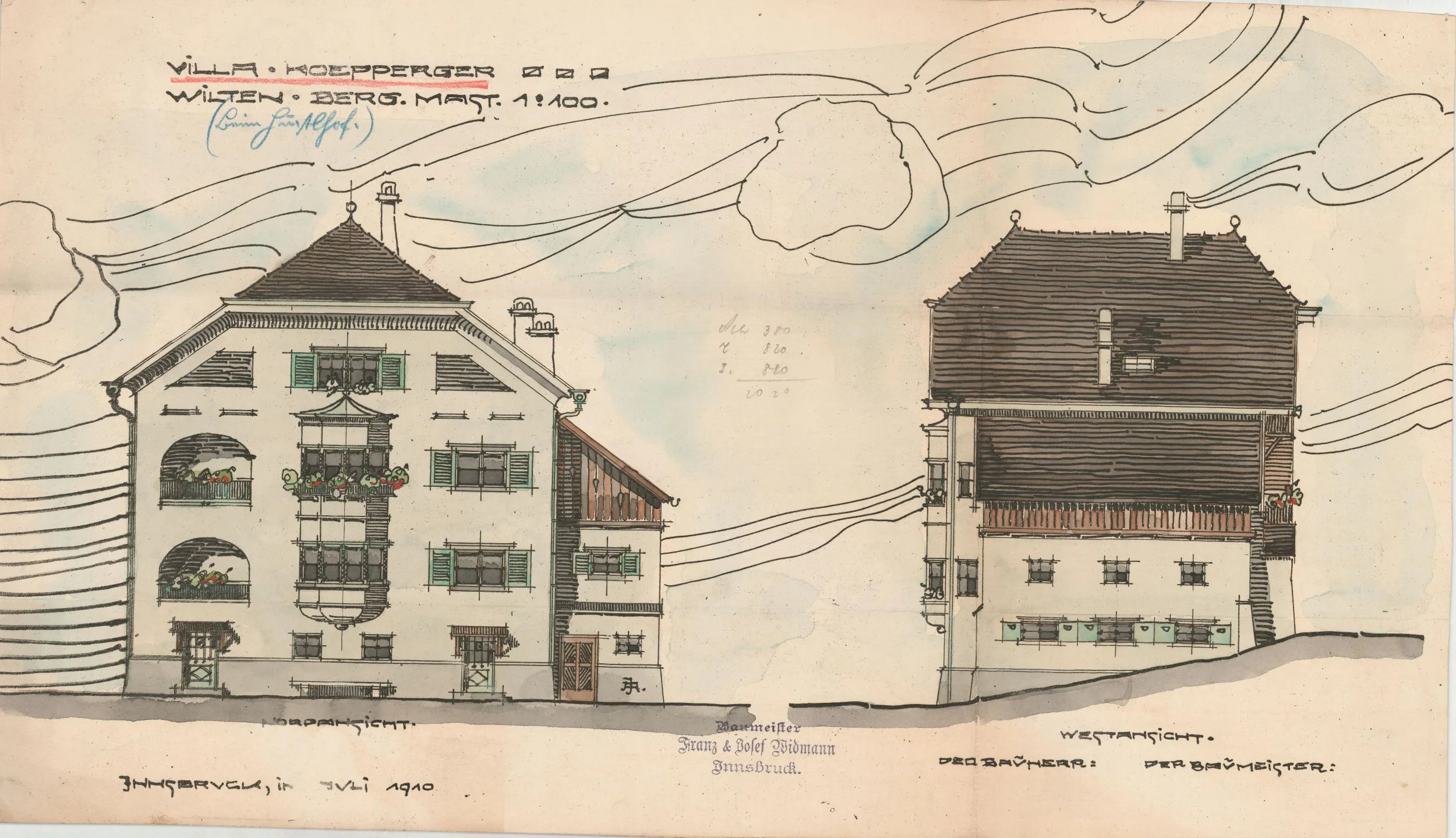 Auch die Innsbrucker Familie Höpperger hatte sich im Frühjahr 1910 an Franz und Josef Widmann gewandt, da sie am Wiltenberg beim Hußlhof ein Haus errichten wollte. Herausgekommen sind dabei die in diesem Beitrag abgebildeten Pläne. Sie zeigen eine schmucke Villa mit Erkern, Balkonen und grünen Fensterläden.