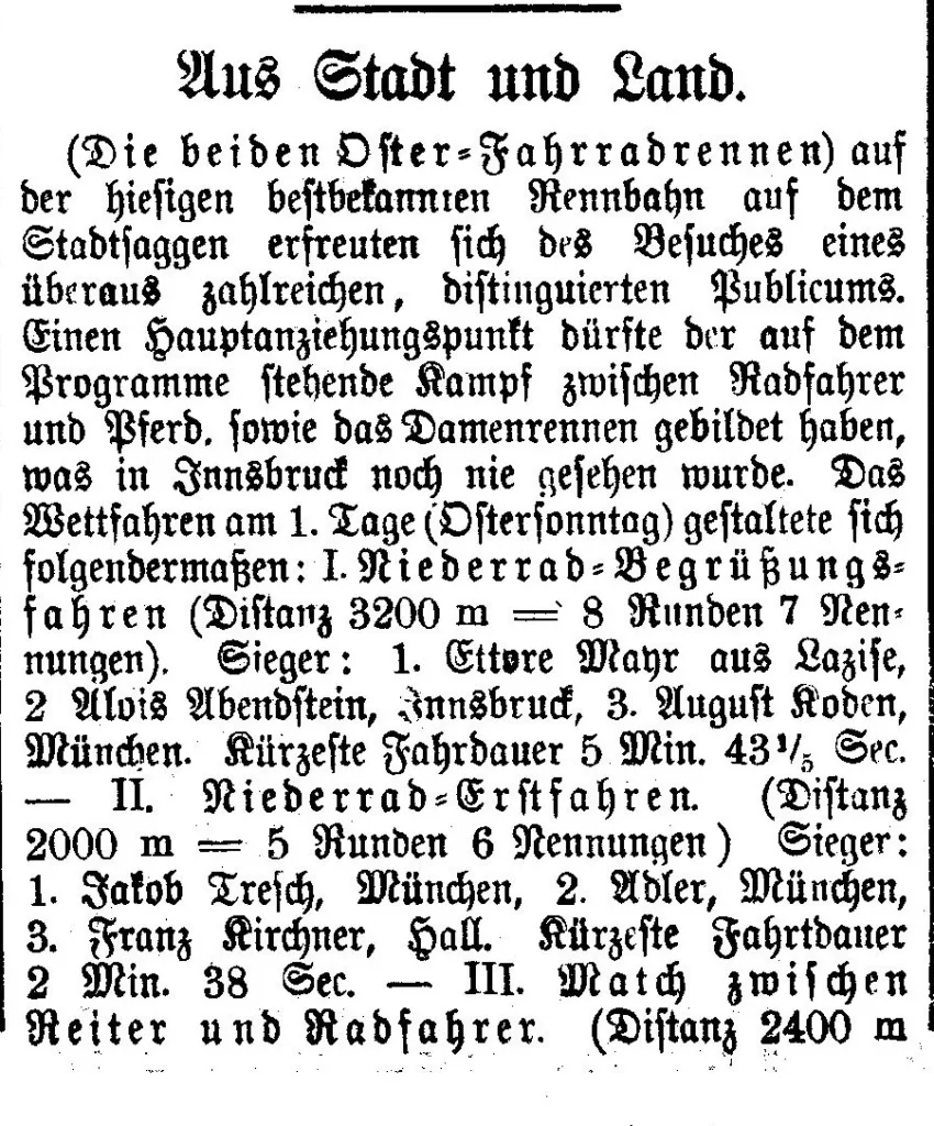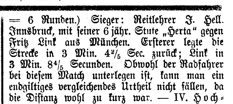 Dieser Vergleich inspirierte in den folgenden Jahren allerdings mehrfach weitere Wettkämpfe zwischen Radfahrern und Reitern. Im Jahr 1898 fand erstmals auch auf der Innsbrucker Radrennbahn im Saggen ein solcher Vergleich statt. Bei dem Rennen über 2.400 Meter siegte der Reiter deutlich. Auch in den kommenden Jahren gab es noch mehrfach solche Wettkämpfe – das Ergebnis war im Übrigen immer dasselbe: über kürzere Distanzen waren Pferde den Radfahrern weiterhin überlegen.