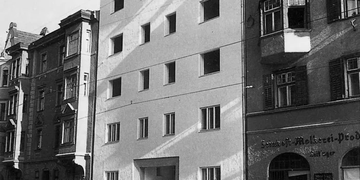 Zu den hölzernen Fensterläden: Man sieht, dass man im 2. Stock zu bequem war, die Jalousin auszutauschen – da sind noch die Winterfenster drinnen! Dabei sind das eh schon modernere wie wir sie in der Pradlerstraße 15 hatten. Ich weiß noch, was für eine Arbeit das jedes Jahr im Frühjahr war. Übern Winter waren sie im Dachboden gelagert, man musste sie reinigen, dann richtig einhängen. Sie waren wohl nummeriert – aber….! Im Herbst gings dann umgekehrt los. Ab und zu ist ein Flügel auf die Straße gefallen, es wundert mich heute noch, dass bei dieser Arbeit nie einer von uns hinunterfiel!