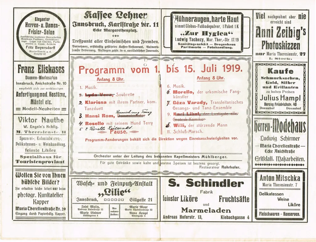 Im Bericht zum Eröffnungsabend (Innsbrucker Nachrichten 3.6.1918, S. 3) wird neben einer Kunstpfeiferin und einem Bauchredner das Wiener Volkssängerpaar Georg und Gusti Eder lobend erwähnt, am meisten Aufsehen dürften allerdings doch „die durch hübsche Lichteffekte in ihrer Wirkung noch gehobenen Phantasietänze der ‚Wewerka‘“ erregt haben, was aus erhaltenen Bildpostkarten der überaus leicht bekleideten Tänzerin zu schließen ist.