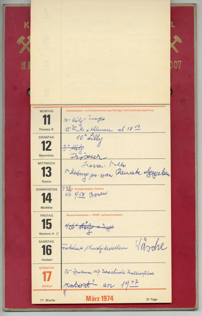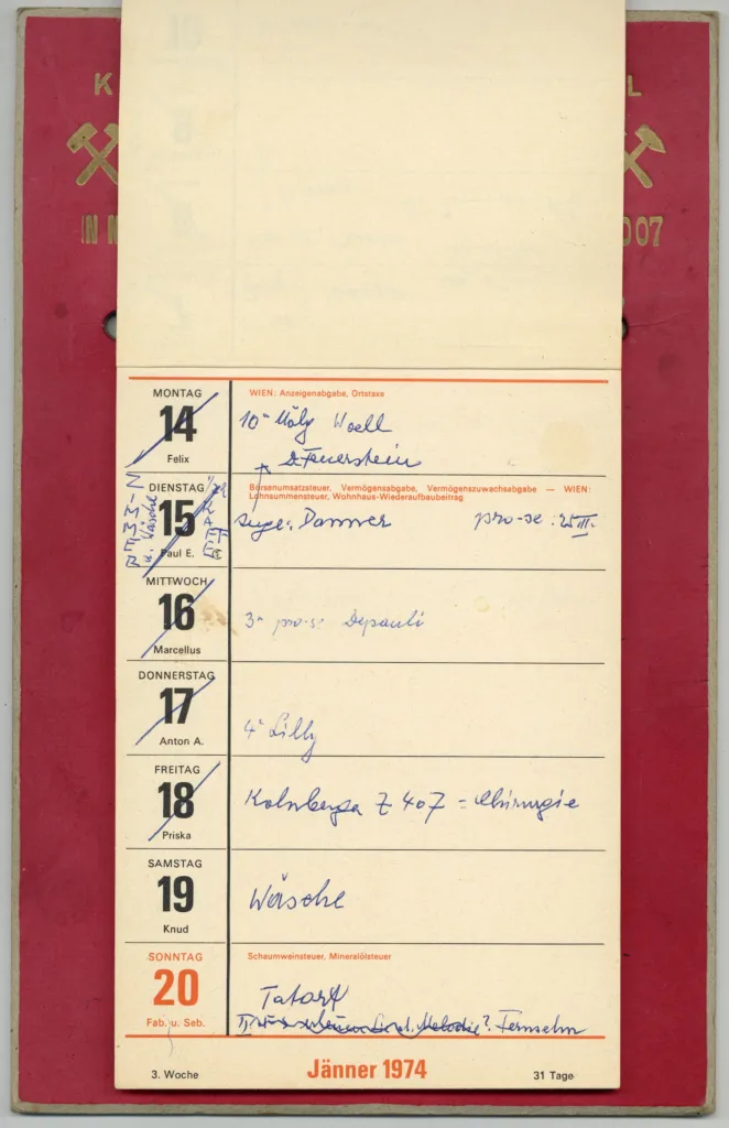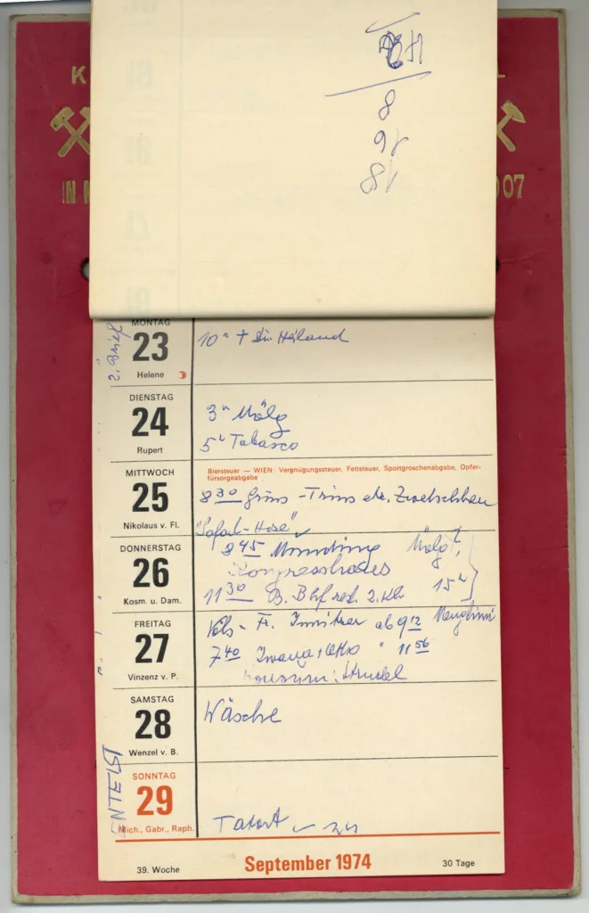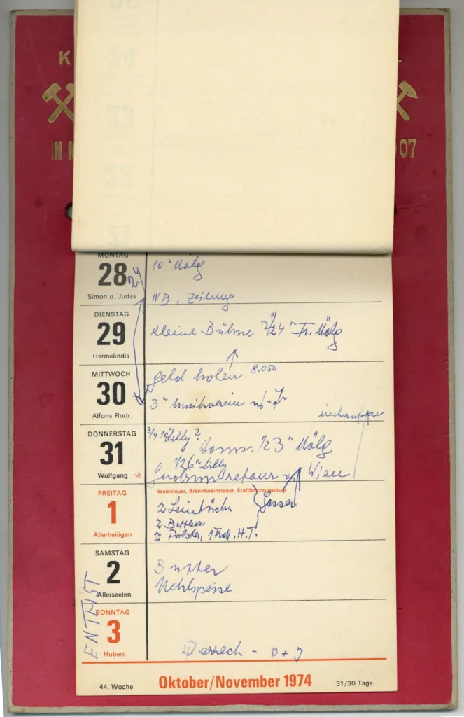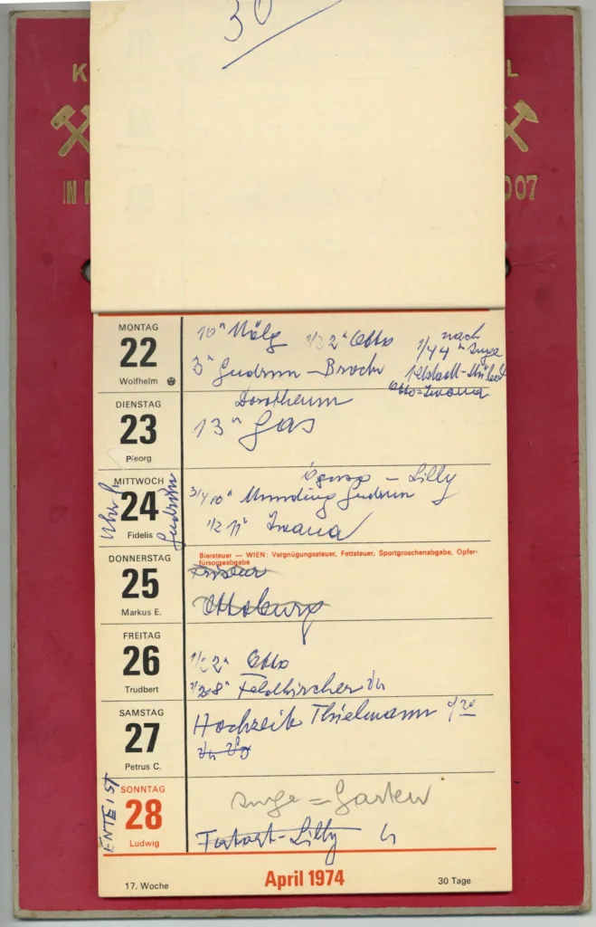 Der Kalender aus der Sammlung von Markus Wilhelm beschreibt in sehr kurzen Codes das zum Glück doch nicht so schlimme Leben in Enterbach. Nicht alle dieser teils auch nach Erledigung wieder ausgekritzelten Termine können wir ganz genau zuordnen. Friseur – OK, aber welcher? Wäsche: die eigene? Eine Theaterprobe, bei welcher Kompanie? Frau K. hatte eine starke Verbindung nach Italien und notierte übers Jahr Zugabfahrts- und Ankunftszeiten nach und von Bozen, Bologna, Venedig und Riccione.