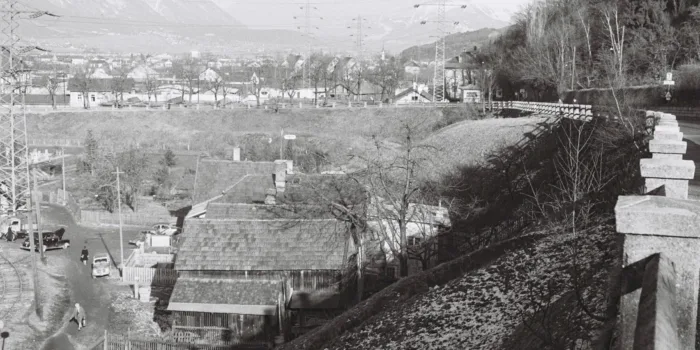 Als Anhaltspunkt sieht man am Bild rechts hinten den „Saurweinhof“ (westlich vom Berchtoldshof), welcher schon mehrmals auf Innsbruck erinnert zu sehen war.