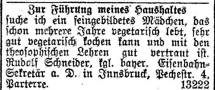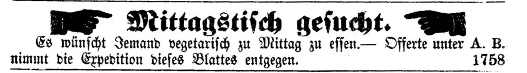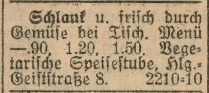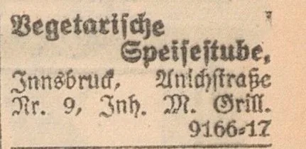 Vereinzelt finden sich in Zeitungen Hinweise auf Vorträge zum Thema Vegetarismus in Innsbruck, immer wieder gibt es auch Annoncen für vegetarische Mittagstische.