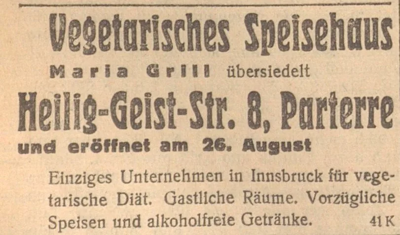 Zumindest in den 1930er Jahren gab es in Innsbruck schließlich auch eine Vegetarische Speisestube, die von Marie (Maria) Grill in der Anichstraße 8 betrieben wurde. Da sich in unseren Beständen bzw. auch in den Zeitungen nur sporadische Quellen dazu erhalten haben, kann ich Ihnen leider nicht viel zu dem Lokal oder deren Besitzerin berichten. Grill wurde jedenfalls 1873 in Brixen geboren und war seit 1916 Witwe. Ihr Mann war als Offizier im Ersten Weltkrieg gestorben. Einen Gewerbeakt konnte ich zu der Speisestube leider nicht finden.
