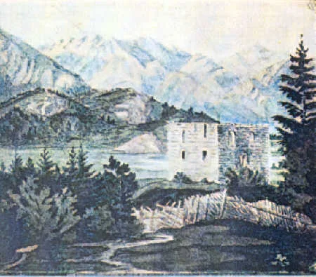 Der Viller See und die Hohenburg vor deren Wiederaufbau 1877 auf einem Ölbild.