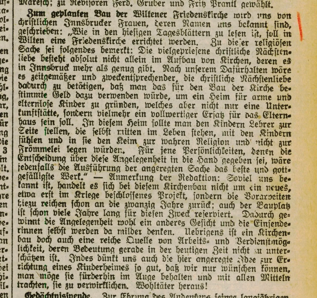 Zurück zum Kirchenbau: 1919 – zehn Jahre nach diesem Plan – wurde ein Wettbewerb ausgeschrieben, was hier zu bauen sei (unter dem neuen Namen Friedenskirche). Gewonnen hat ihn Lois Welzenbacher, damals immer noch als junger Deutsch-Südtiroler tituliert. Der Plan selbst ruht vielleicht im Archiv für Baukunst, bei uns ist er nicht zu finden. Es blieb beim Plan. Die Zeitungen berichteten von den prämierten Projekten, die katholischen Blätter motivierten zu Spenden an den Kirchenbauverein – so direkt nach dem Ersten Weltkrieg und so kurz vor der alle angesparten Geldbeträge verschlingenden Hyper-Inflation war aber die Motivation dazu dürftig. Eine Zuschrift an dieInnsbrucker Nachrichten im März 1919 bringt das allgemeinde Gefühl der Innsbrucker:innen ganz gut auf den Punkt:
