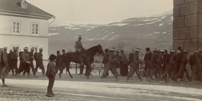 Es ist nicht selten, dass sich auf Postkarten des späten 19. oder des frühen 20. Jahrhunderts militärische Motive finden. Aber für gewöhnlich zeigen sie wehende Banner, voranpreschende Husaren und glorreiche Feldherren. Doch auf dieser Postkarte findet sich ein gänzlich anderes Bild. Auf der Rückseite der Karte ist auf Deutsch und Tschechisch ein Zitat des preußischen Feldmarschalls Helmuth von Moltke abgeduckt:
