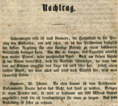 Dabei klang das Ziel der Auswanderung durchaus idyllisch: Die Siedlung Tirol im Bundesstaat Espírito Santo wurde 1859 von Tiroler und Vorarlberger Familien (hauptsächlich aus dem Stubai- und Inntal) gegründet. Das Dorf liegt inmitten von atlantischem Regenwald, etwa 80 km von Vitória entfernt, und war ursprünglich als landwirtschaftliche Kolonie gedacht. Heute erinnert Tirol eher an eine Mischung aus Alpendorf und Tropenidyll – mit katholischer Kirche, traditionellem Handwerk und deutsch-österreichischem Erbe, das sich in Kultur und Architektur widerspiegelt. Wie es Ihnen erging lesen wir hier in einem Bericht.