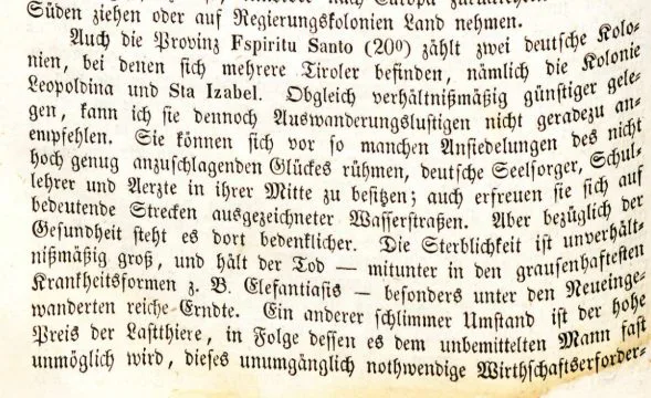 – so lässt sich der Rat eines deutschen Pfarrers in Südbrasilien zusammenfassen. In seinem 24-seitigen Bericht darüber, warum man besser nicht auswandern sollte, warnt er eindringlich vor den Schattenseiten des tropischen Lebens: Mais (Milreis) als eintönige Hauptnahrung, gefährliche Krankheiten wie Elephantiasis, ein beschwerliches Dasein ohne Winterpause, da das Land das ganze Jahr über bewirtschaftet werden kann – und Schlangenbisse, die quasi zum Alltag gehören sollen.