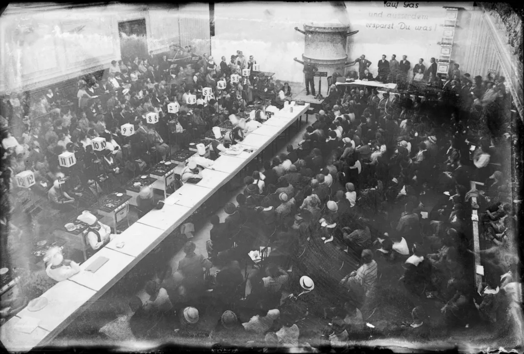Fangen wir aber zunächst damit an, was auf dem Bild zu sehen ist: Dass wir uns in den Innsbrucker Stadtsälen (großer Stadtsaal) befinden, ist einigermaßen klar. Der Aufnahmezeitpunkt ist schon weniger eindeutig, ich würde jedoch auf die Zwischenkriegszeit tippen. Was sehen wir? Ein Bühne mit einem Bühnenbild, bei dem vor allem ein überdimensionaler Turm aus Töpfen hervorsticht, im Publikumsraum eine Reihe von Gasherden, eine lange Tafel sowie zahlreich erschienenes Publikum. Meine Schlussfolgerung lautete daher dahingehend, dass es sich bei der Veranstaltung wohl um eine Werbeshow für Gasherde oder für Töpfetürme (oder beides) handeln müsse. Vielleicht war damit auch ein Kochwettbewerb verbunden, was die zahlreichen (nummerierten) Herde erklären würde.