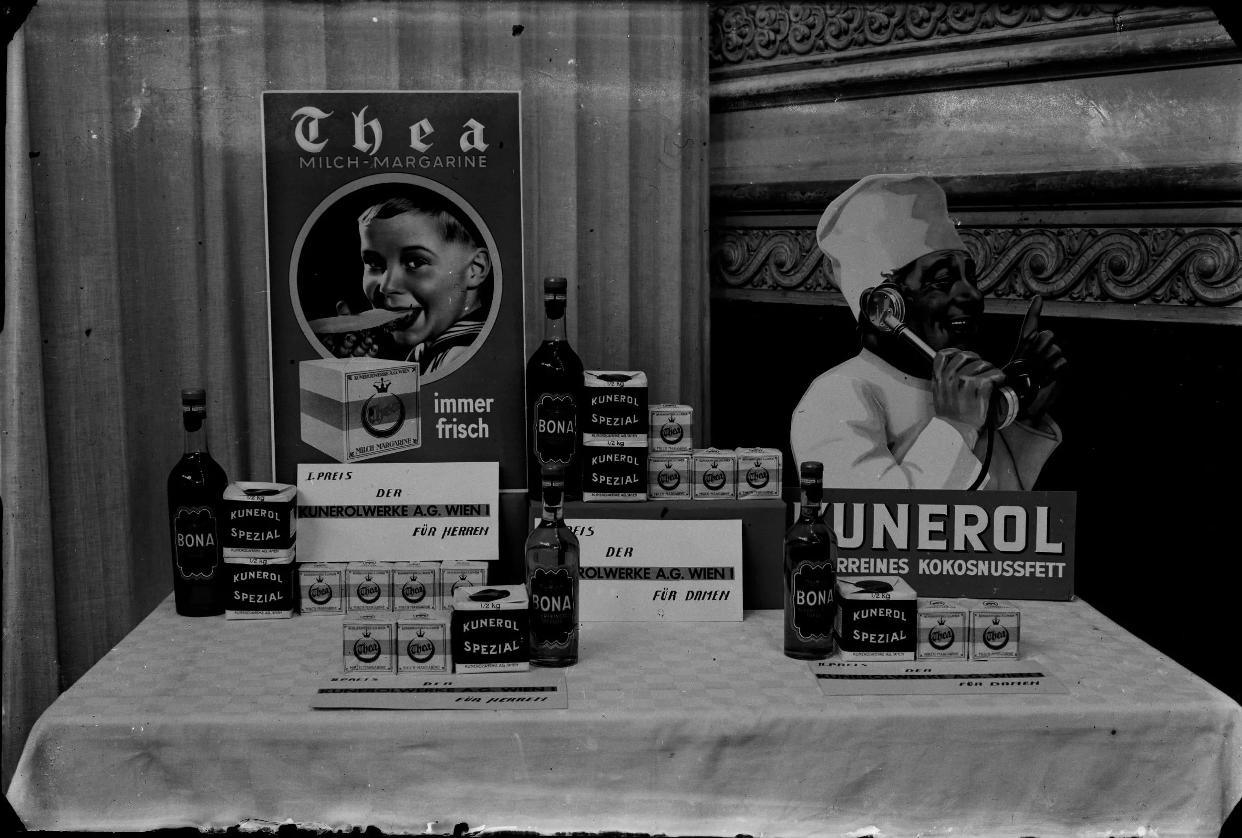 Das zweite Bild zeigt wohl dieselbe (oder eine ähnliche) Veranstaltung. Hier ist am Rand der Bühne auch eine Musikgruppe zu erkennen und – kaum zu sehen – auch ein Tisch mit Werbung für Thea-Margarine und andere Produkte, wovon ein eigenes Foto existiert.