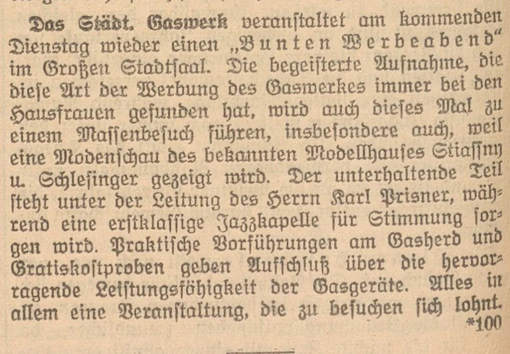 Mit diesen Beobachtungen, Annahmen und Schlussfolgerungen habe ich dann ein wenig in ANNO recherchiert – allerdings bin ich dabei nicht sehr weit gekommen. Ich konnte zwar verschiedene Nachrichten finden, in denen für Veranstaltungen in den Stadtsälen geworben wird, bei denen das Kochen mit Gas erklärt wird, allerdings passten die Beschreibungen nie ganz genau auf das, was im Bild zu sehen ist.