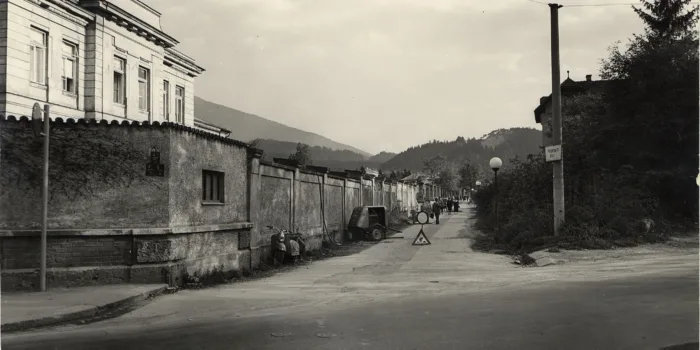 Auf den Gehsteigen sind fast gleich viel Menschen unterwegs wie heute. Die Fahrzeugdichte ist allerdings geringer. Deutlich geringer. Hinten die Rhomberg-Fabrik. Links an der Ecke der Angerzellgasse die Büste des Magistratsrats Erler.
