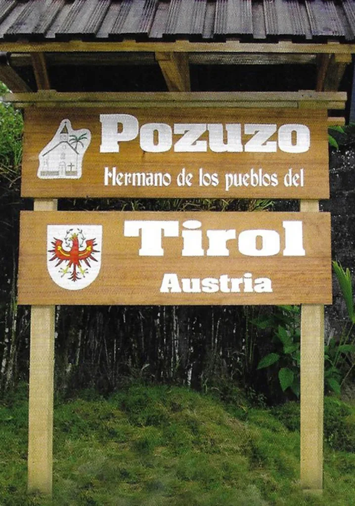 Titelbild: der neue Bogen am Ortseingang von Pozuzo; Zweites Bild: Schild „Tirol“